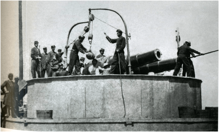 - Delante de estas tres últimas baterías, y fondeados entre dos aguas, se colocan cuarenta torpedos (en esa época torpedo era el nombre de una carga explosiva equivalente a la actual mina, se les da fuego eléctricamente desde tierra o desde un buque cuando un buque enemigo pasa cerca, los cálculos se han de hacer a ojo, y por eso están pintadas de rojo).