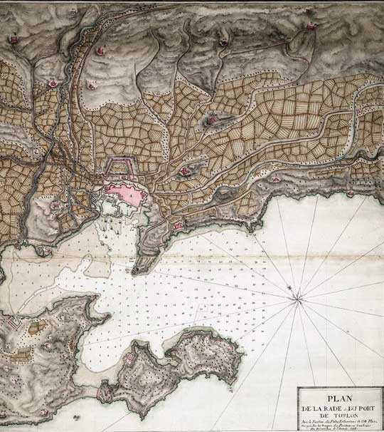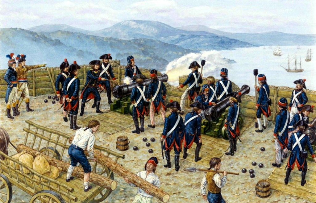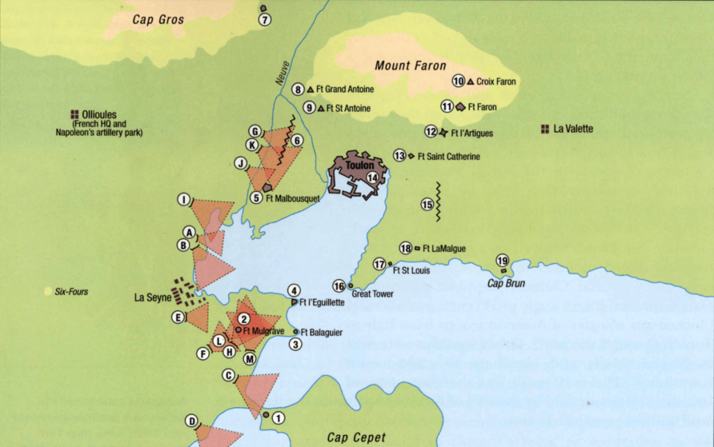 (4) El 16 de septiembre, después de ser nombrado jefe de artillería, Napoleón mandó abrir fuego con las batería emplazadas cerca de la costa Cap Négre y Beau Rouge rompieron fuego contra embarcaciones inglesas. Al siguiente día lo continuaron con otras tres baterías cercanas al pueblo de La Seyne. Duelos artilleros del 18 de septiembre entre baterías republicanas de La Seyne, y las baterías flotantes y los buques aliados. Napoleón estableció su primera batería en la colina de Saint-Laurent, conocida como de “la Montaña” con cañones 4×24 y 1×36, protegidos por una pared de madera con escombros. La distancia de 3.500 metros resultó excesiva.