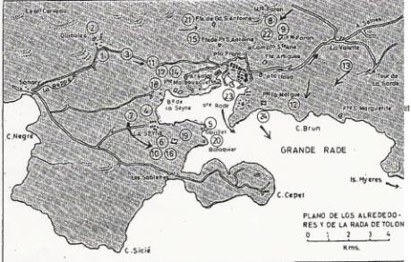 (3) Combates del 7 de septiembre. Apoyo de la retirada de Ollioules. Días después el capitán Napoleón Bonaparte se incorporó al frente y se sorprendió cuando descubrió que los pocos cañones disponibles, estaban mal asentados, colocados a dos disparos de distancia del puerto, y las bolas que estaban destinadas a destruir la flota terminaban golpeando las casas de campo vecinas.