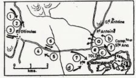 (a) Ataque del General Dundas con tres columnas: derecha, republicana; centro, española, e izquierda, anglo-sarda después del éxito inicial, ha de retirarse. (b) Príncipe de Pignatelli (cerca de San Antonio el Chico) en misión de apoyo del ataque por la derecha. (c) General Valdés (cerca del puente de Ollioules), en misión de apoyo por la izquierda. (d) Columna francesa que ataca a Malbousquet y es rechazada por refuerzos y luego lanchas cañoneras. (e) Emplazamiento de la artillería (británica). (f) Gravina sale y apoya la retirada.