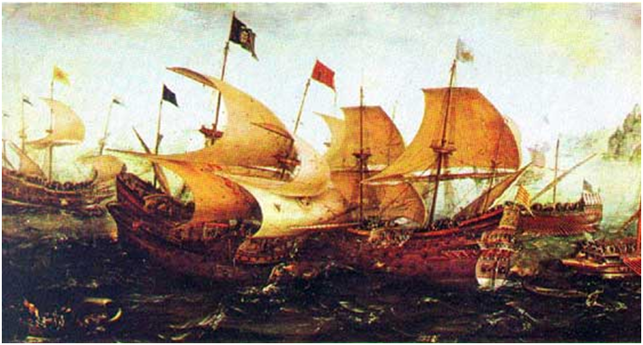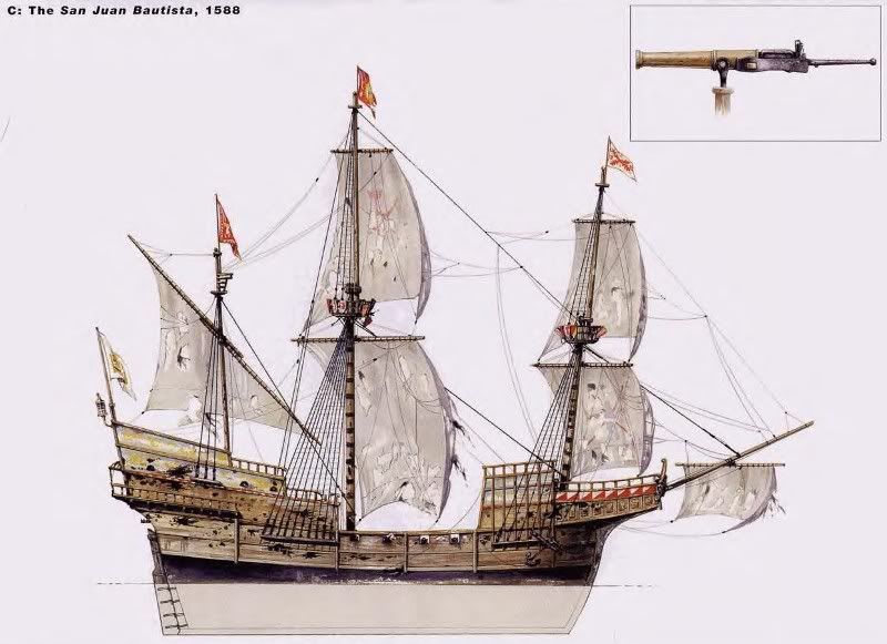 En 1588 los galeones y naos tenían la artillería repartida por las bandas. Había quedado atrás el combate clásico de las galeras embistiéndose de proa, para jugar su artillería proel y emplear el espolón, y saltar al abordaje. Ahora había que presentar los costados al enemigo, pronto habría de aparecer la línea de combate.
