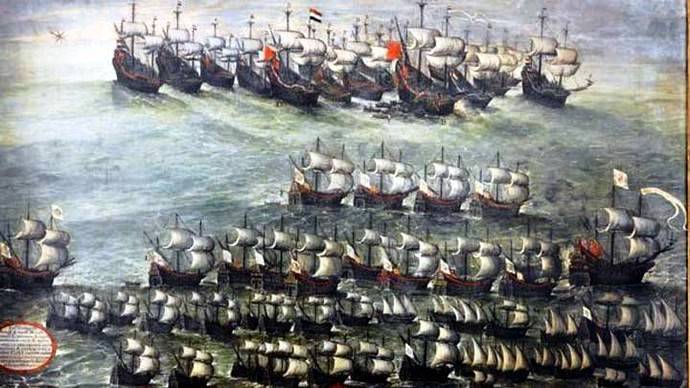 El 12 de septiembre fue avistada una armada holandesa que, mandada por Adrien Hans-Pater, acababa de saquear la isla de Santa María, almirante que había sustituido a Lonk. El almirante holandés tuvo el gallardo pero presuntuoso gesto de ordenar que sólo atacasen a los españoles dieciséis de sus buques, cuando su escuadra estaba compuesta de treinta y tres, porque era conocedor del poder de la escuadra de Oquendo, en la que solo ocho buques eran galeones que no llegaban al nivel de los suyos, como el resto eran mucho más pequeños, pensó que solo combatirían sus dieciséis escogidos de entre los mejores, contra los ocho españoles más importantes, a pesar de no enviar a toda su escuadra el enfrentamiento estaba a su favor, puesto que lo harían dos contra uno.