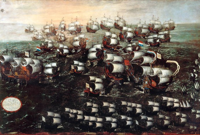 La escuadra holandesa se encontraba a barlovento por ello avanzó a todo trapo desplegada en arco; entonces, con hábil maniobra consiguió Oquendo aferrarse a la capitana enemiga por barlovento de tal modo que los fuegos y humos fuese hacía el holandés.