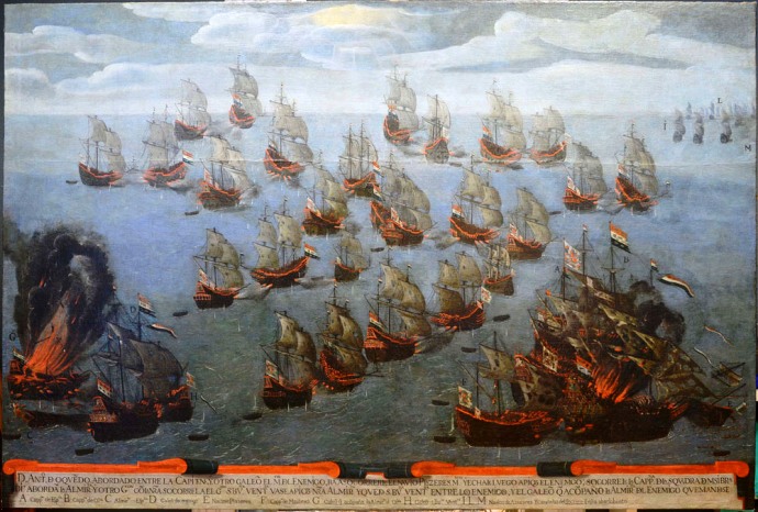 El combate llevaba ya más de ocho horas de duración, las fuerzas empezaban a faltar y lo peor, que el día comenzaba a diluirse en la oscuridad de la noche, cuando ya Oquendo comenzaba a pensar en dejar el combate, desde la proa de su buque se efectuó un disparo, el cual al parecer el proyectil se llevó por delante el taco incendiado, lo que se tradujo en que fue alcanzada la santabárbara de la capitana bátava y la hizo saltar por los aires, al ver el comienzo del incendio, el almirante holandés se lanzó al mar donde se ahogó, solo que otros muchos de su dotación le siguieron y todos acabaron igual.