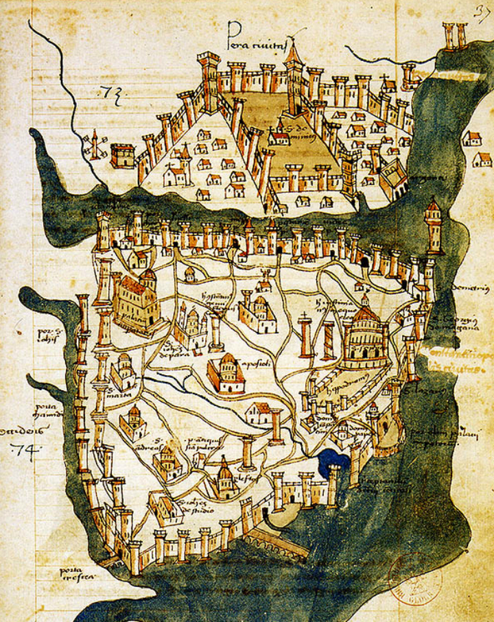Por otro lado, Venecia, localizada en la parte más septentrional del Adriático, por su propia localización geográfica, pretendía controlar la parte oriental del Mediterráneo. Sin embargo, su influencia en oriente estaba siendo seriamente amenazada por Génova, la cual controlaba de facto el comercio con Bizancio, como muestra la inmensa colonia, Pera (también llamada Gálata), construida junto a Constantinopla, al otro lado del Cuerno de Oro.