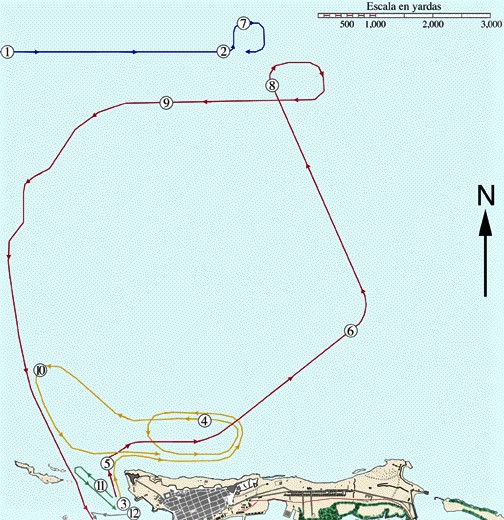 1 11:00. am. El USS Yale, que cumplía la misión de bloquear el puerto de San Juan, viene acercándose a la costa con rumbo al oeste a unas 6.500 yardas. Desde el día 29 de abril y de manera intermitente, se realizaba el bloqueo en previsión de la llegada de la escuadra de Cervera.