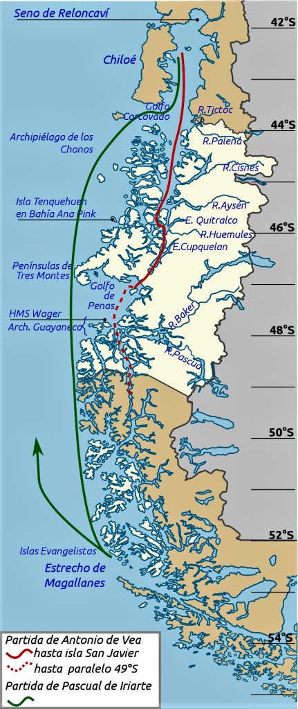 En Chiloé la expedición fue dividida en un grupo a cargo directo de Antonio de Vea que navegaría hacia el sur siguiendo la línea de la costa y otro grupo dirigido por Pascual de Iriarte que navegaría a mar abierto directamente desde Chiloé hasta la entrada occidental del estrecho de Magallanes, que sería el punto de reunión de ambas partidas.