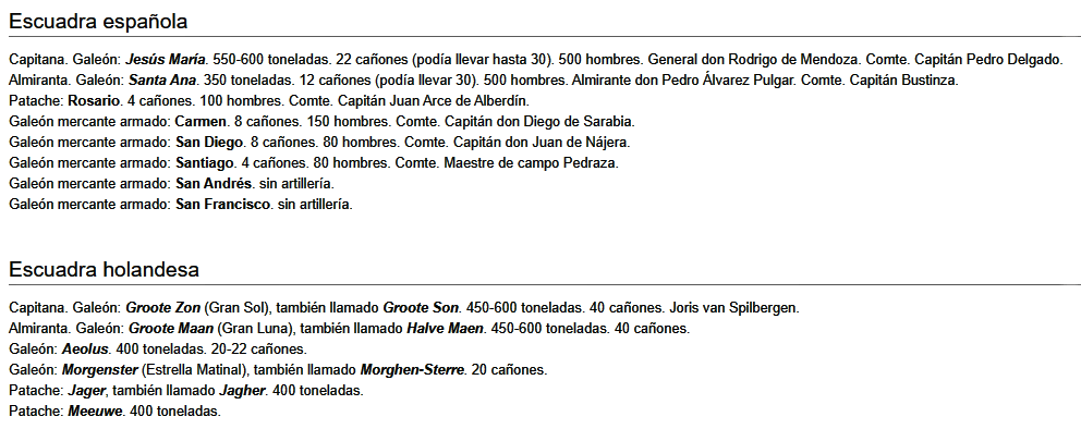 La Armada del Mar del Sur, estaba formada por 7 barcos: 2 galeones de la Corona (Jesús María y Santa Ana), y 5 barcos mercantes (Carmelita, Santiago, San Francisco, San Andrés, y otro) a los que se habían acoplado 56 cañones y con 620 hombres armados. Los españoles tenían una clara ventaja en términos de armas individuales, pero los holandeses les doblaban en cañones, además, de calibre superior.