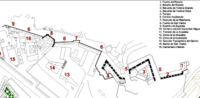 Son los muros aspillerados con sus fosos y glasis, que partiendo desde el desaparecido fuerte de San Miguel cerraba con el vértice de Victoria Chica. Supone pues el cerramiento amurallado entre fuertes desde la altura del Cubo hasta la zona llana de las huertas.