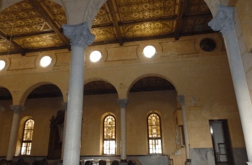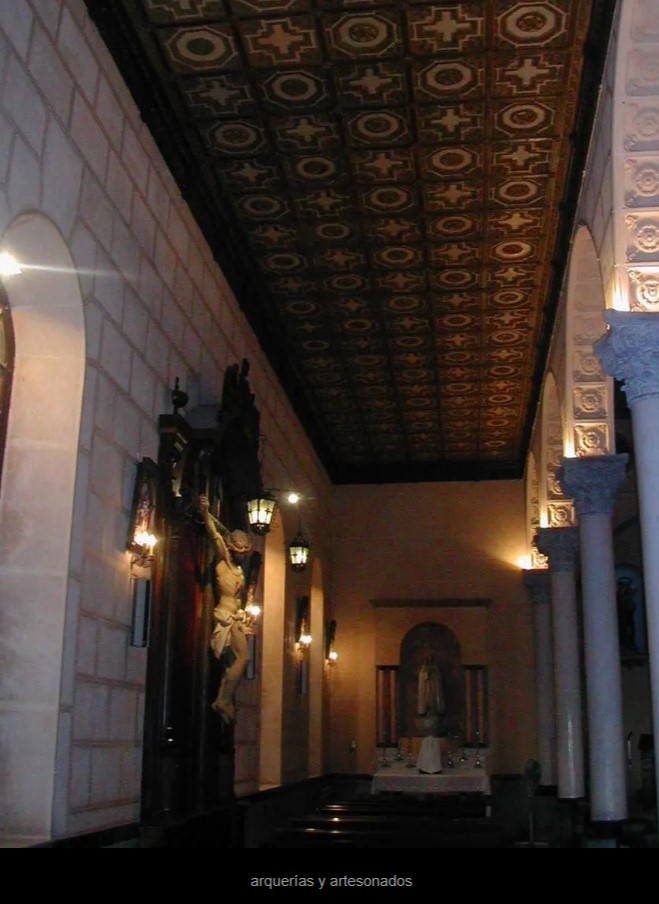 Su cubierta es plana, decorada con casetones y en el del nivel de las naves laterales se abren claraboyas circulares, cuyo ritmo se continúa en los medallones de la cabecera.